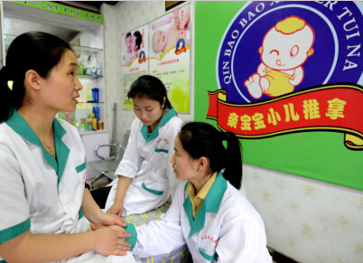 5月2日,安排五位残疾人实现就业的河南省盲人创业之星胡明明(左)在和盲人按摩技师交流