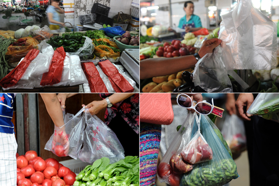 在长沙市岳麓区的滨江农贸市场,拎着塑料袋的市民随处可见。几乎每个摊位上都挂着一叠塑料袋,市民要买东西,卖家就随手扯下一个。