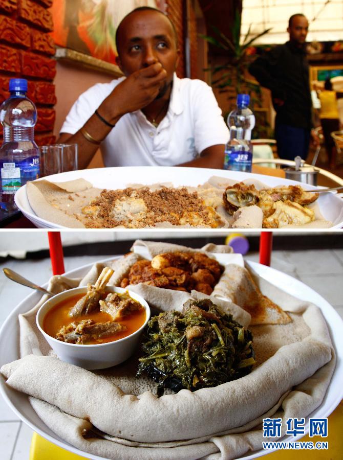 非洲的饮食文化别具一格,质朴而狂野,不同国家、不同民族的饮食特征也极具地方特色。埃塞俄比亚美食英吉拉是用一种类似青稞的粮食加工而成的软饼。磨好的面经过两天的发酵,做成大大圆圆的英吉拉软饼,在英吉拉饼上铺上各种菜肴后,就可以食用了。上图:一名埃塞俄比亚人在首都亚的斯亚贝巴一家饭店内品尝英吉拉。 下图:一份英吉拉配上各种菜肴。(拼版照片,摄于2014年6月7日)新华社发
