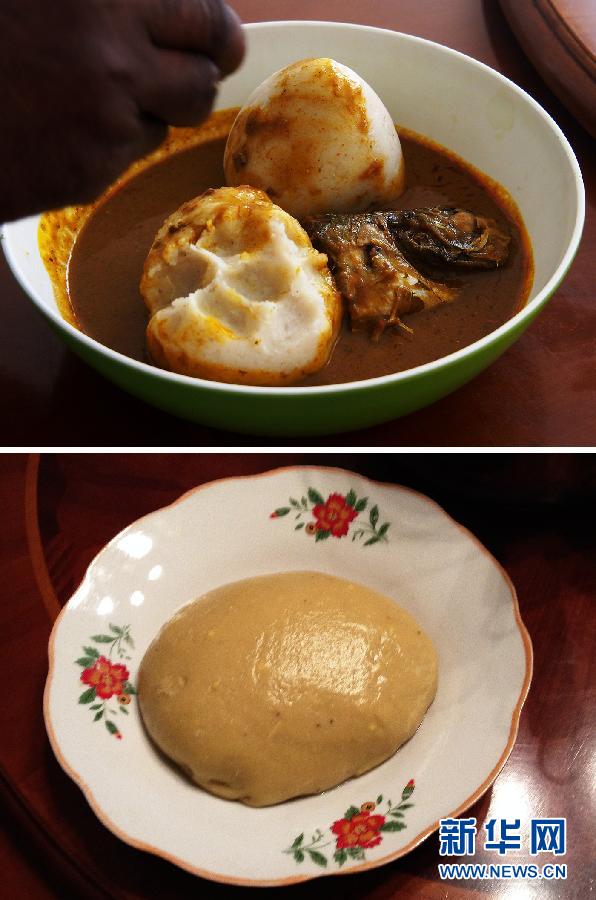 非洲的饮食文化别具一格,质朴而狂野,不同国家、不同民族的饮食特征也极具地方特色。富富是加纳的“国民美食”,主要原料是木薯和芭蕉。在加纳许多地方都能见到两人合力制作富富的场景:一个木臼,一根长达两米的木槌,一人不断执槌猛捣臼中的木薯和芭蕉,一人则一边扶着木臼、一边不断用手翻动木薯和芭蕉,并不时加水以保持其黏性,直到变得细腻圆润。光有主食还不行,加纳人还要在做好的富富上浇满香辣口味的肉汤或鱼汤,其中还拌有棕榈油。吃的时候一定要在桌上备好清水用于洗手,因为这道“西非名吃”必须要用右手抓着蘸汤吃。上图:一名加纳当地人在阿克拉吃蘸着鱼汤的富富。 下图:一份做好的富富。(拼版照片,摄于2014年3月25日) 新华社发