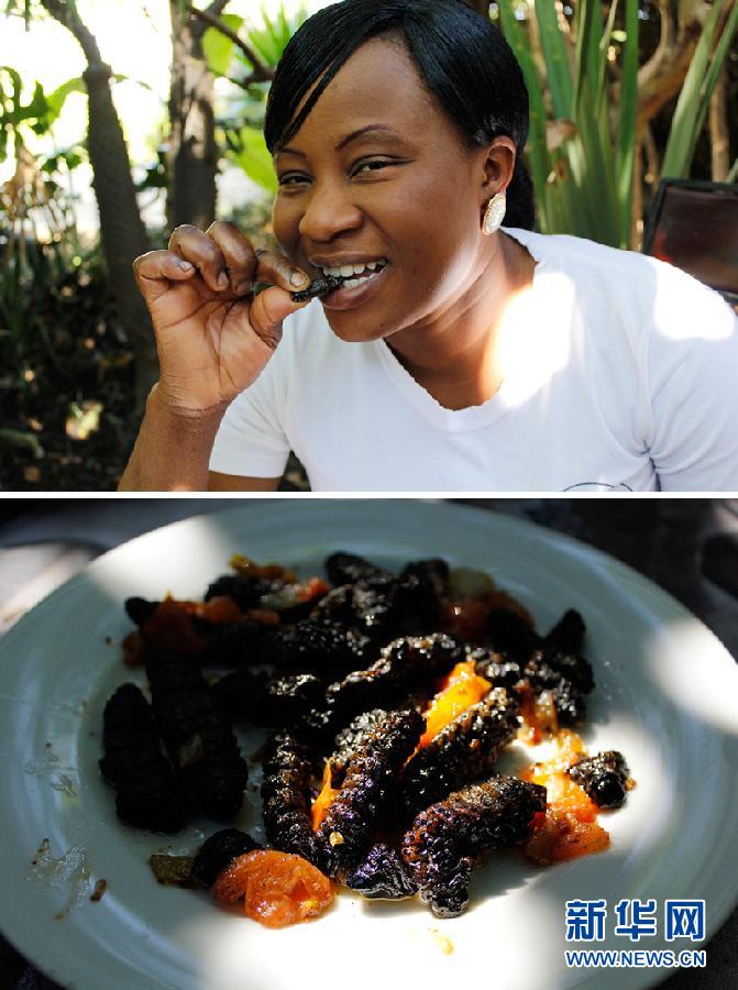 非洲的饮食文化别具一格,质朴而狂野,不同国家、不同民族的饮食特征也极具地方特色。津巴布韦人爱吃烤肉虫,他们认为肉虫烤起来不仅味道鲜美,而且蛋白质丰富,是绝佳的补品。在津巴布韦,各大超市里都售卖或炸或烤的肉虫干,是当地人的餐桌大爱。上图:在津巴布韦首都哈拉雷一家餐厅,一名当地食客在吃烤肉虫。 下图:一份加工好的烤肉虫。(拼版照片,摄于2014年6月1日) 新华社发
