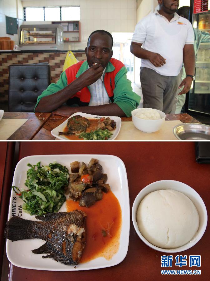 非洲的饮食文化别具一格,质朴而狂野,不同国家、不同民族的饮食特征也极具地方特色。 “西玛”是一种赞比亚最常见的主食,通常由白色玉米面烹制,制作时,先将玉米粉撒入开水中煮成粥状,然后逐步加入更多的玉米粉,并不停搅拌直到粘稠,再小火闷上一会儿即可。食用时,赞比亚人习惯佐以鸡肉、牛肉或者鱼类炖制的菜肴,以及西红柿、洋葱、豆子、白菜等素菜,菜中一定要带有汤汁。用手取一块“西玛”,单手反复揉捏成团,蘸着菜汤食用。除了玉米面,在赞比亚北部地区,也会用木薯作为制作“西玛”的原料,而南部一些地区用高粱作为原料,小米也是常见原料之一。上图:一位赞比亚人在首都卢萨卡品尝“西玛”和配菜。 下图:“西玛”和配菜。(拼版照片,摄于2014年5月28日) 新华社发