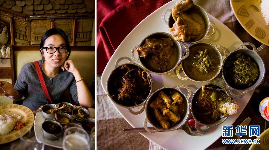 非洲的饮食文化别具一格,质朴而狂野,不同国家、不同民族的饮食特征也极具地方特色。马达加斯加饮食皇家七件套以前只供皇室享用。如今,马达加斯加富裕人士和观光客也可以体验这套大餐:主菜装在七个铝制小碗内,分别有罗非鱼、鳗鱼、猪肉配苜蓿叶、炸牛肉丝、鸭腿、鸡腿、青菜,采取炖或油炸的烹饪方法。根据传统,七件菜肴全部放在一个大盘子里。左图:一名中国游客在马达加斯加首都塔那那利佛的一家餐厅内品尝皇家七件套。右图:马达加斯加著名的皇家七件套。(拼版照片,摄于2014年6月6日) 新华社发