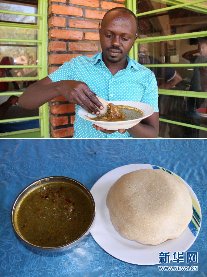非洲的饮食文化别具一格,质朴而狂野,不同国家、不同民族的饮食特征也极具地方特色。乌加利在肯尼亚、坦桑尼亚、卢旺达等国家是非常受欢迎的主食,一般是将玉米粉烹调,做成面团的形状。这款主食能搭配很多菜肴,在食用乌加利的时候,当地人喜欢将乌加利掰碎,就像中国人吃羊肉泡馍一样泡进菜汁中。上图:一个卢旺达人用乌加利蘸着菜汤食用。 下图:一份乌加利(右)配上一份菜汤。(拼版照片,摄于2014年6月3日) 新华社发