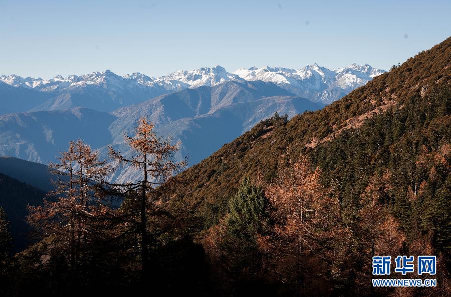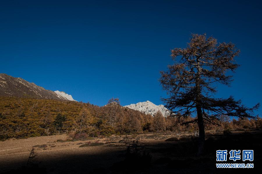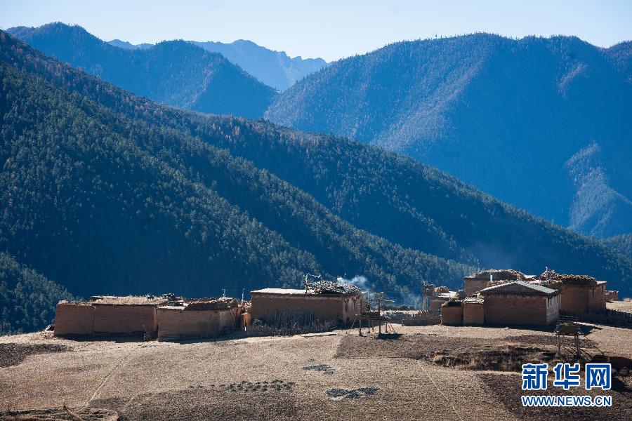 嘎金雪山景区甲子村一角(11月28日摄)。嘎金雪山景区位于四川省得荣县城西北方向40公里处,这里山连山,树相依,衬托藏牧民在特殊自然环境中创造的藏寨、林间草场和牧棚,一派独特的康巴人文风情。新华社记者 江宏景 摄