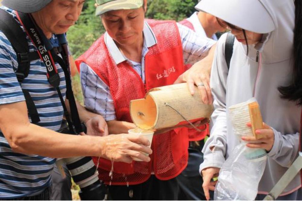 ↑十八排徒步活动中,当地导游为游客倒凉茶。