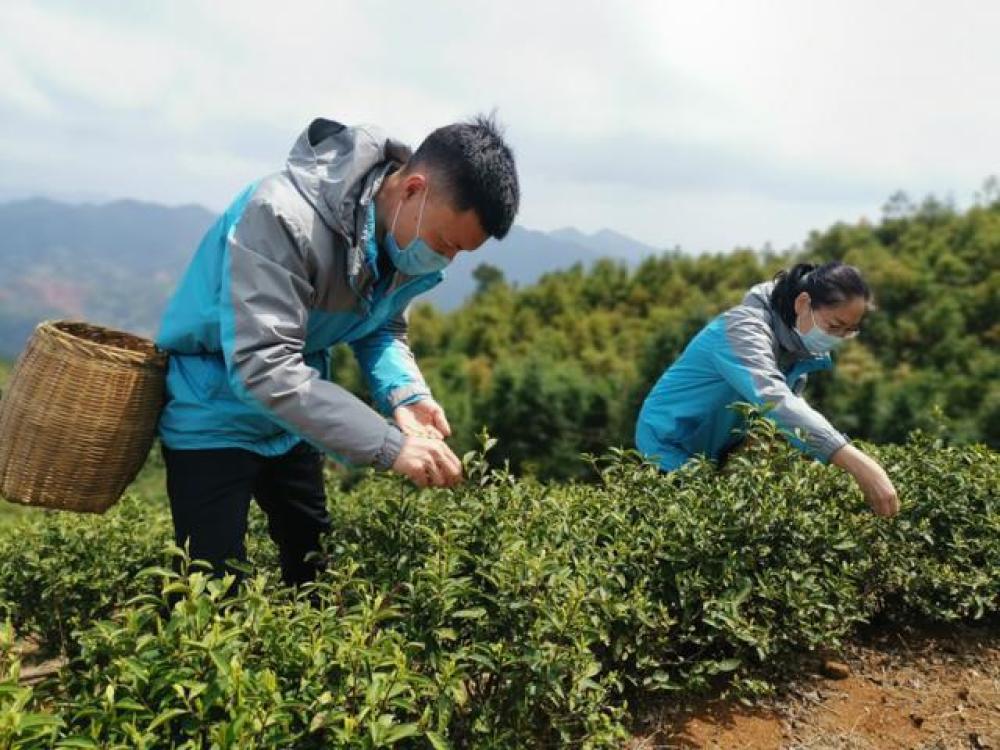 ↑江西区域扶贫项目部在茶园帮忙采茶(左为方军)。