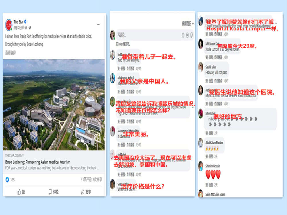 《星报》帖文在FaceBook发出仅数小时已获近200个赞,不少网友的关注点集中在乐城的环境、医疗设施及价格方面。网友Md Sohel评论说:“去美国治疗太远了,而现在可以考虑新加坡、泰国和中国。”网友Kalam Khan留言想知道在博鳌乐城治疗与在吉隆坡治疗有什么不同。还有网友跃跃欲试表示准备带儿子去乐城体验。