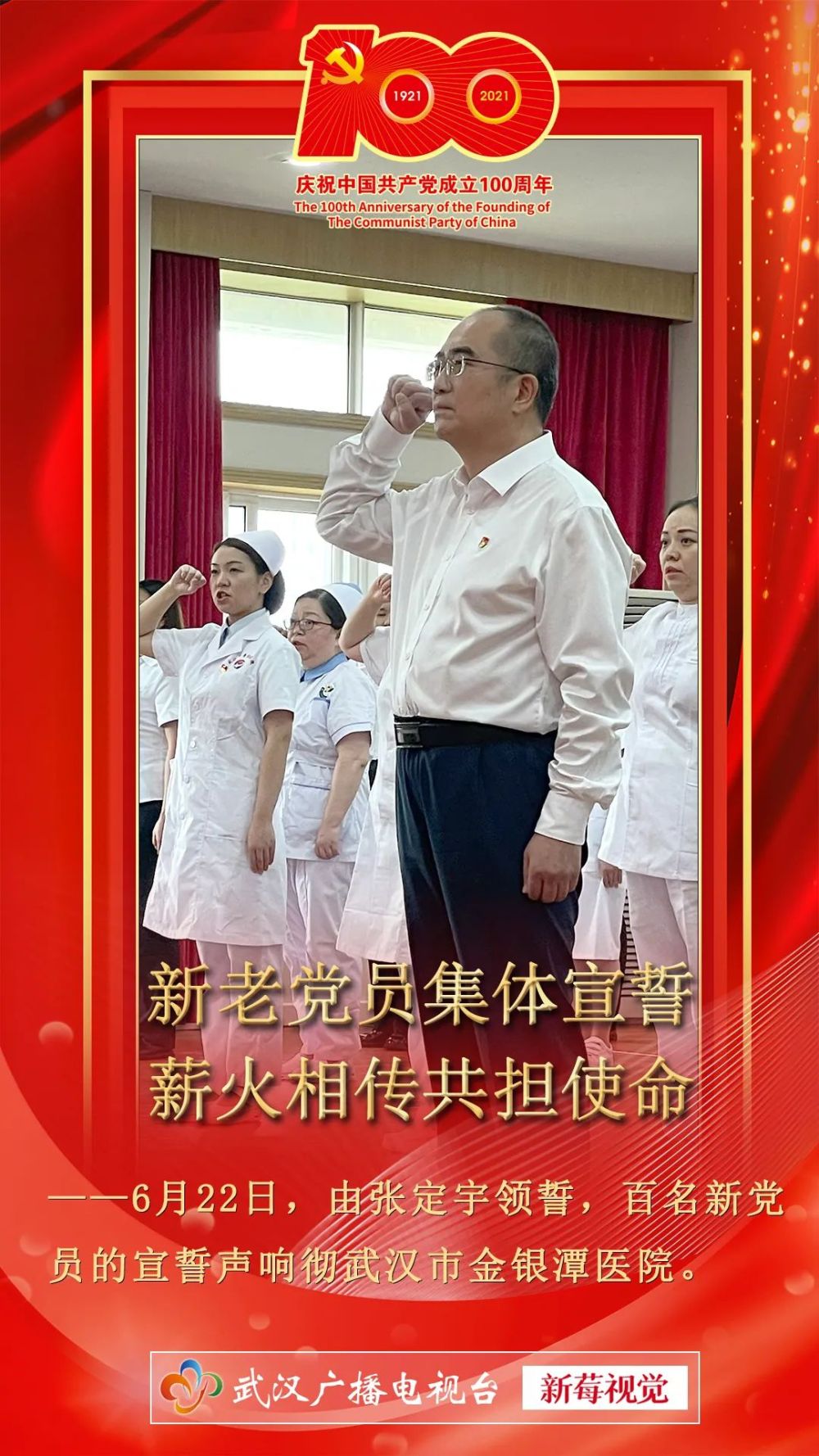 近日,来自武汉市市属各医院的医生、护士、行政人员中90名新发展党员和华中科技大学同济医学院10名新发展学生党员,在武汉市金银潭医院党员活动中心开展入党宣誓仪式。