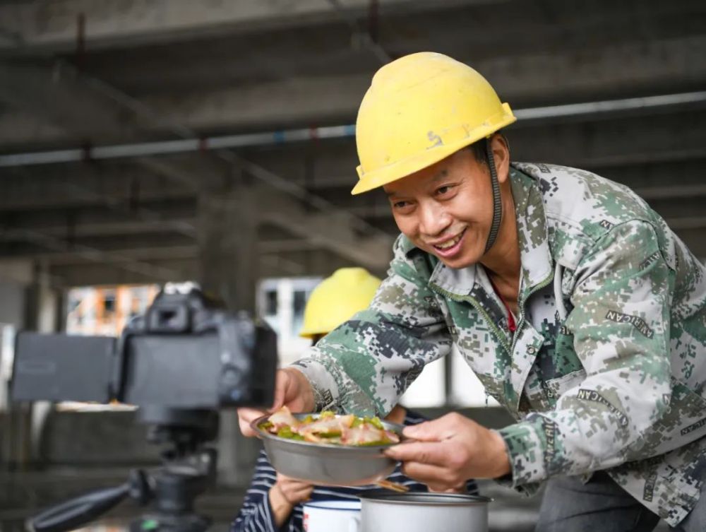 汗流浃背的劳动后,干饭是最香的。工地毛坯房里,砖头垫成凳子,木头箱子当桌子,一口热气腾腾的电饭锅,一盆油水十足的炒肉,面前半米是三脚架上的相机。