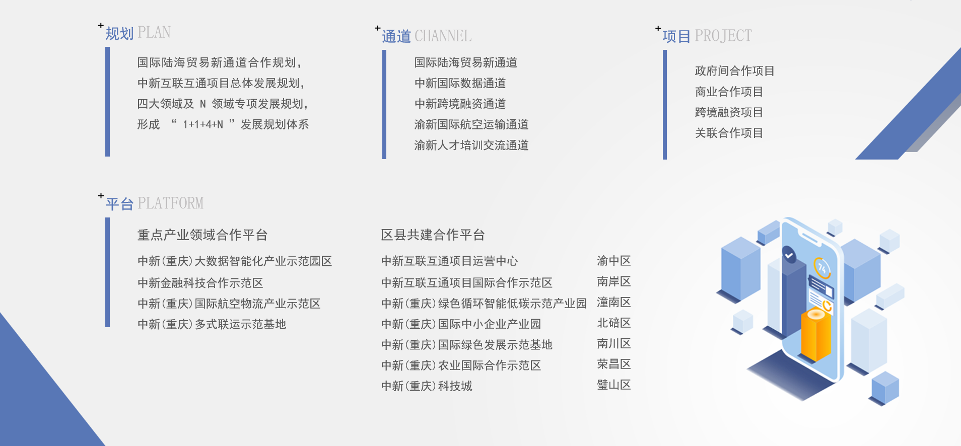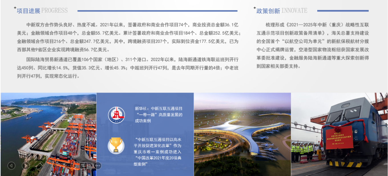 一是规划。完成了“1+1+4+N”规划体系,联合编制了《国际陆海贸易新通道合作规划》、《中新互联互通项目总体发展规划(2021-2025)》、四大重点领域专项规划以及农业、教育、文旅等其他领域专项规划。