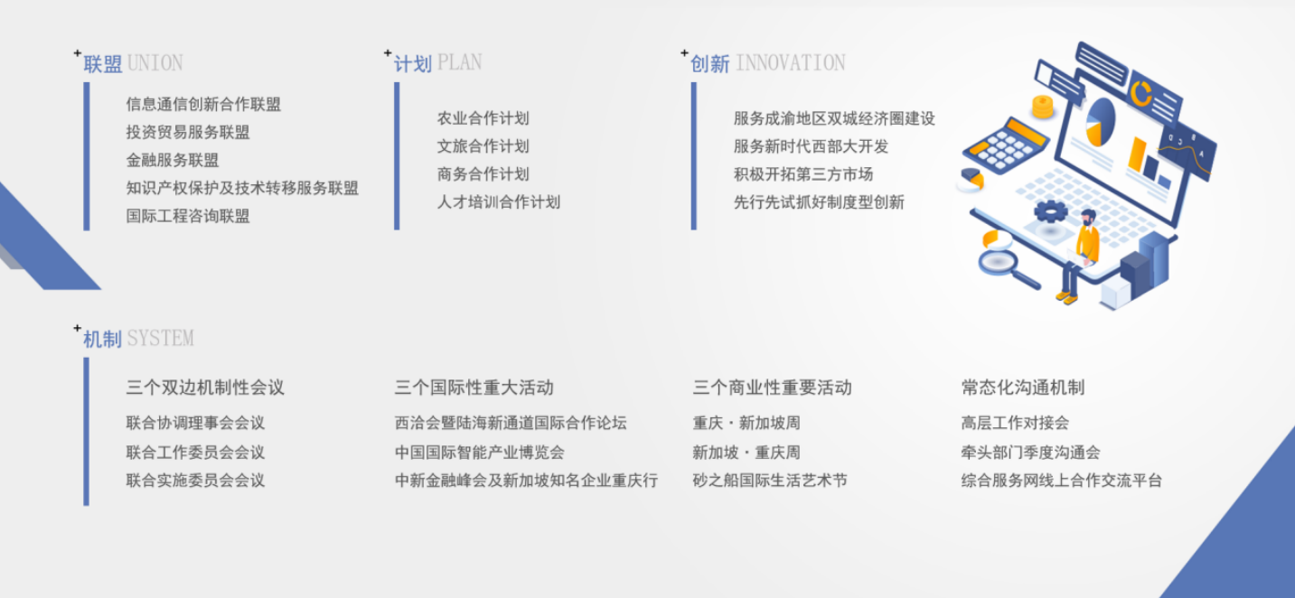五是联盟。积极推动中新两国企业、事业单位、商协会“结对子”,相继成立中新(重庆)信息通信创新合作联盟、投资贸易服务联盟、金融服务联盟、知识产权保护及技术转移服务联盟及国际工程咨询联盟,不断提高专业服务水平。