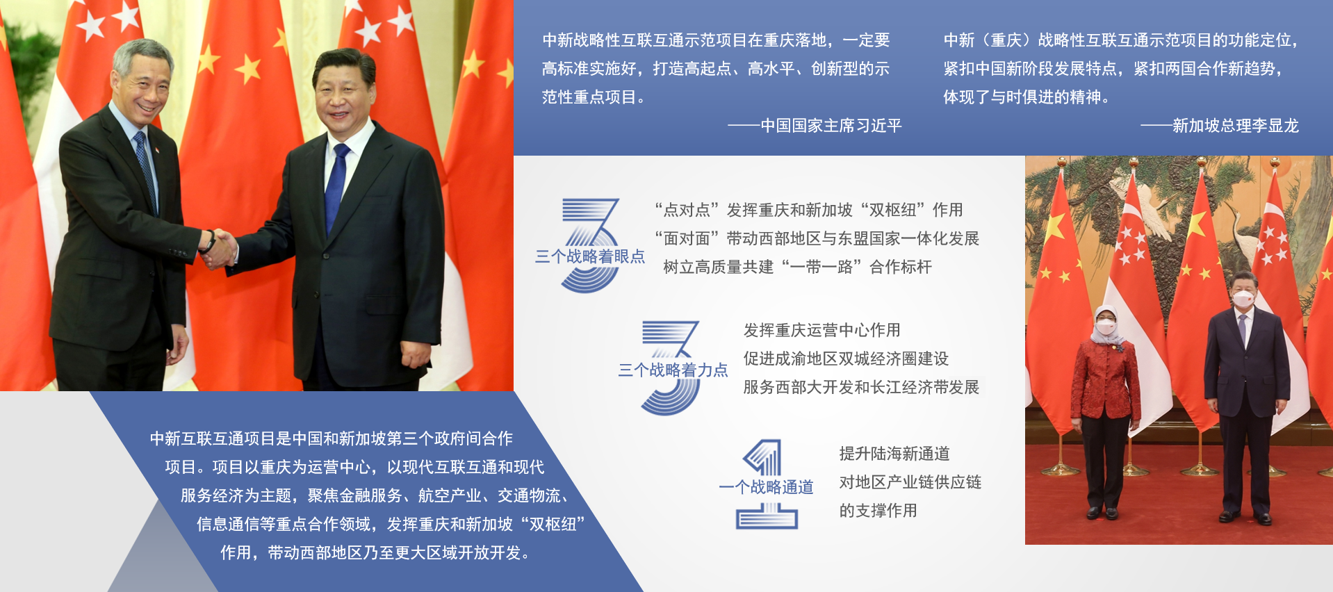 中新(重庆)战略性互联互通示范项目是中国和新加坡第三个政府间合作项目。2015年11月7日,在中国国家主席习近平和新加坡总理李显龙的共同见证下,两国政府在新加坡签署协议,宣告中新互联互通项目正式启动。项目以重庆为运营中心,以现代互联互通和现代服务经济为主题,聚焦金融服务、航空产业、交通物流、信息通信四大重点领域,发挥重庆和新加坡的“双枢纽”作用,带动西部地区乃至更大区域开放开发。