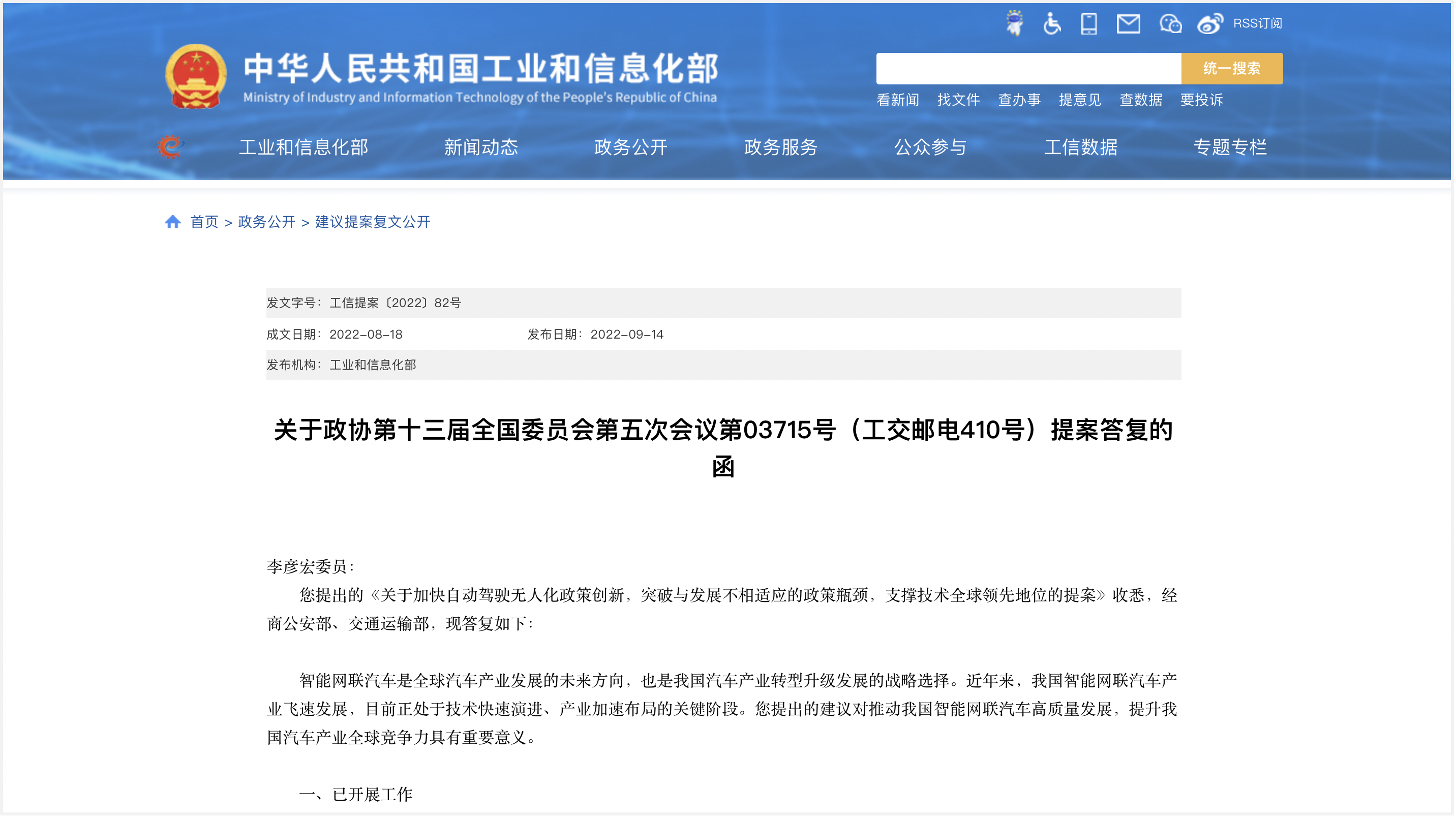 工业和信息化部(简称工信部)日前对全国政协委员关于加快自动驾驶无人化政策创新的提案作出答复,表示智能网联汽车是全球汽车产业发展的未来方向,也是我国汽车产业转型升级发展的战略选择,今后将联合公安部、交通运输部、住房和城乡建设部等部门,在推动更多地方先行先试、推进智能网联汽车产品准入试点、智能交通基础设施建设等方面,持续推动我国智能网联汽车高质量发展。