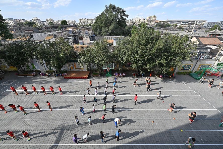 西城区炭儿胡同小学学生在操场上参加各类课后活动。该校坐落在老北京胡同内,人均运动面积不足1平方米 李鑫 摄