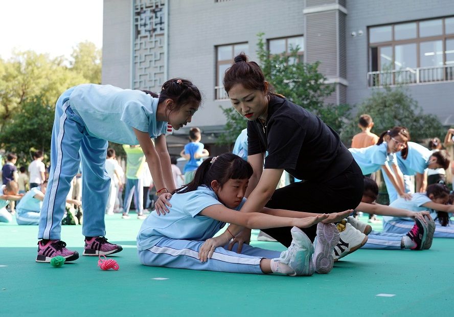 在西城区自忠小学,老师在体育课上指导学生进行柔韧练习 任超 摄