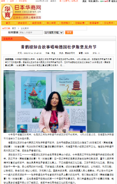 2022年9月,德国北莱茵-威斯特法伦州(北威州)“中国节”在杜伊斯堡市中心开幕。武汉作为“中国节”上唯一设展的中国城市,在活动期间的文化展台,汉剧与杂技、黄鹤楼模型、汉欧班列绘本、《字绘武汉》AR互动图书等武汉元素圈粉众多市民与游客。境内外40余家主流媒体予以报道;德国首都电视台在《中国新闻》栏目予以报道;欧洲华文媒体《欧洲时报》官网及由六个平台组成的总粉丝量超百万的公众号矩阵同步发布。
