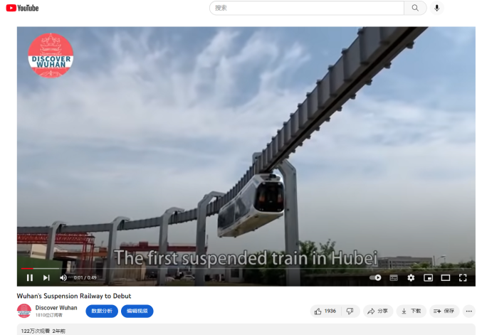 武汉“光谷空轨列车”视频被YouTube首页推荐,浏览量突破100万,展现了这座城市的科技发达;