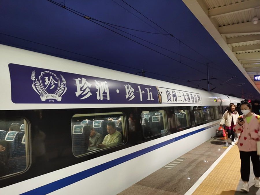 3月26日,珍酒冠名的快速旅客列车暂时停靠在凯里南站。(郭宇铭 摄)