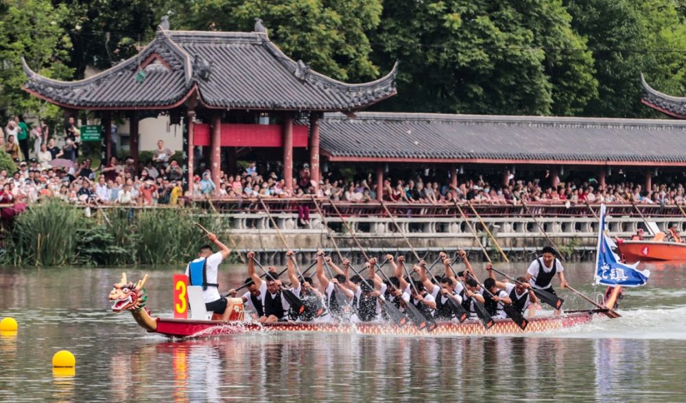 本次龙舟锦标赛共有10支代表队参加。随着一声令下,500米长的赛道上,一条条龙舟如离弦之箭、出水蛟龙,击鼓、挥桨、争渡,在铿锵有力的鼓声中、整齐划一的口号声下,运动员们劈波逐浪,上演“速度与激情”,为观众献上了一场精彩比拼。护城河两岸观赛区域,呐喊声、助威声不断,观众们纷纷拿出手机、相机记录下精彩瞬间。