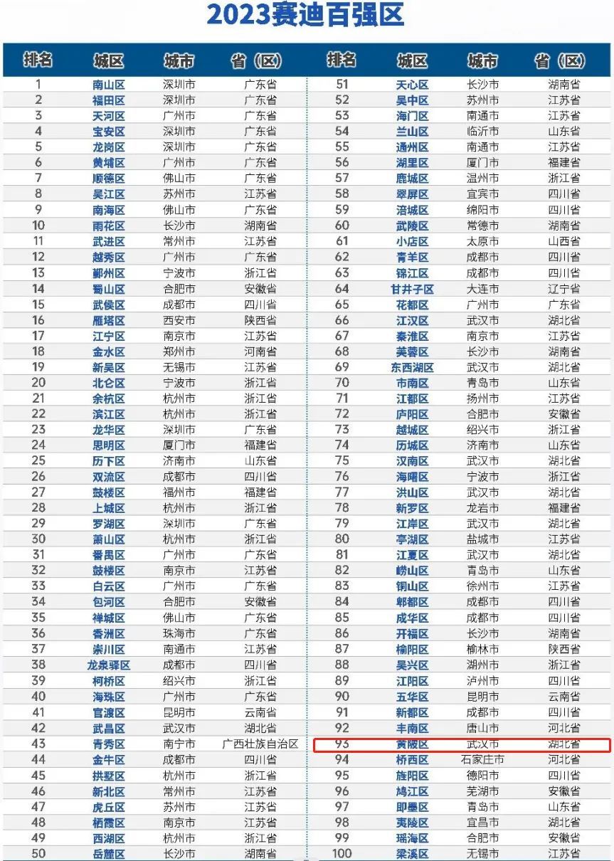 8月8日,工信部下属研究机构赛迪顾问发布“2023赛迪百强区”,黄陂区上榜“全国百强”榜单。