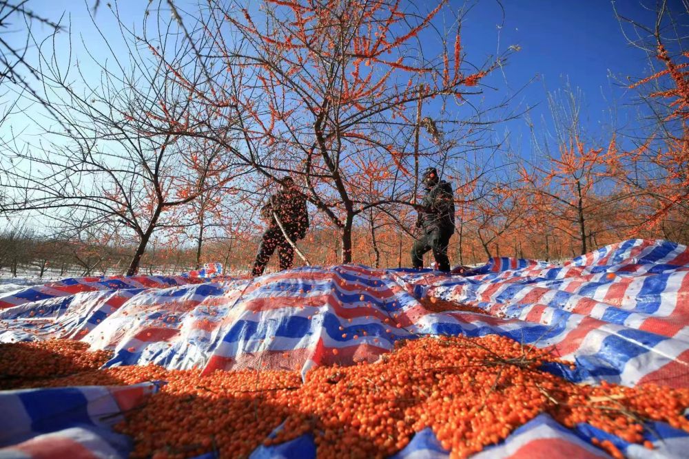 村民在采摘沙棘果实。