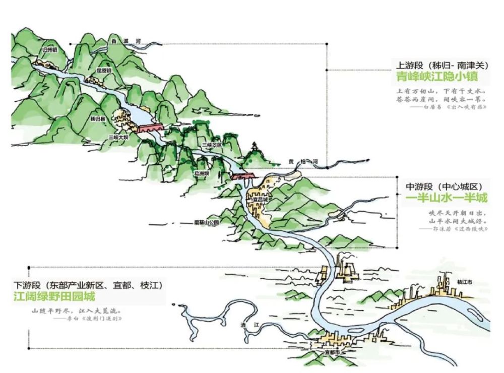 上游段(秭归至南津关),塑造“青峰峡江隐小镇”大美山水风貌。呈现远岭青峰、两崖夹江、小镇隐于山水的景观格局,强化“一江七水、两脉青山”的青峰峡江格局,营造隐于山水的灵动小镇。