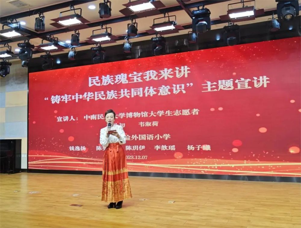 12月7日,卓刀泉街道名都花园社区党委联合洪山实验外国语小学党总支,开展“民族瑰宝我来讲”主题宣讲活动,铸牢中华民族共同体意识,推动家校社协同育人机制常态化运行。