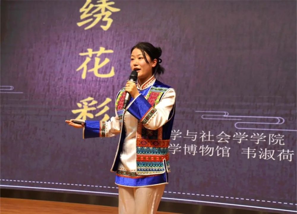 宣讲环节,来自高校、社区的青年志愿者依次登台,展示不同民族瑰宝蕴含的文化内涵。中南民族大学民族学博物馆的大学生志愿者泽让初,以《嘉绒藏族文化》为主题,用生动有趣的方式展示嘉绒藏族的传统服饰、建筑和习俗。同样来自该馆的韦淑荷以“镇馆之宝”——京族绣花彩为脉络,讲述京族的历史沿袭。