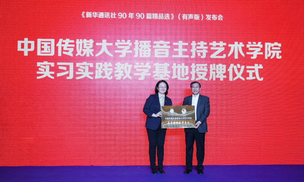 发布会现场,中国传媒大学播音主持艺术学院实习实践基地正式在新华出版社挂牌。新华出版社总编辑许新代表新华出版社接受中国传媒大学播音主持艺术学院党委副书记、院长喻梅授牌。