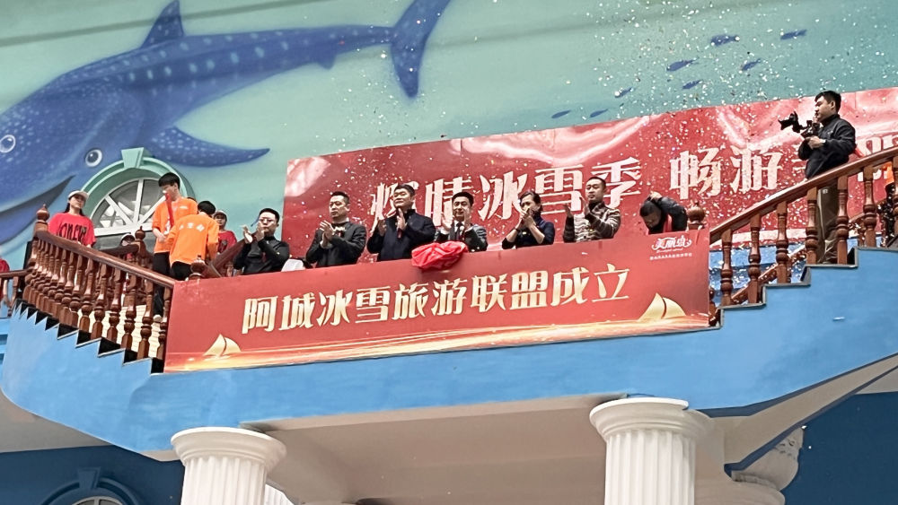启幕仪式现场,美丽岛温泉水世界、松峰山旅游度假区、玉泉国际狩猎场、森工平山旅游区、大金古城景区、金上京历史博物馆等成员单位负责人共同为阿城冰雪旅游联盟揭幕。
