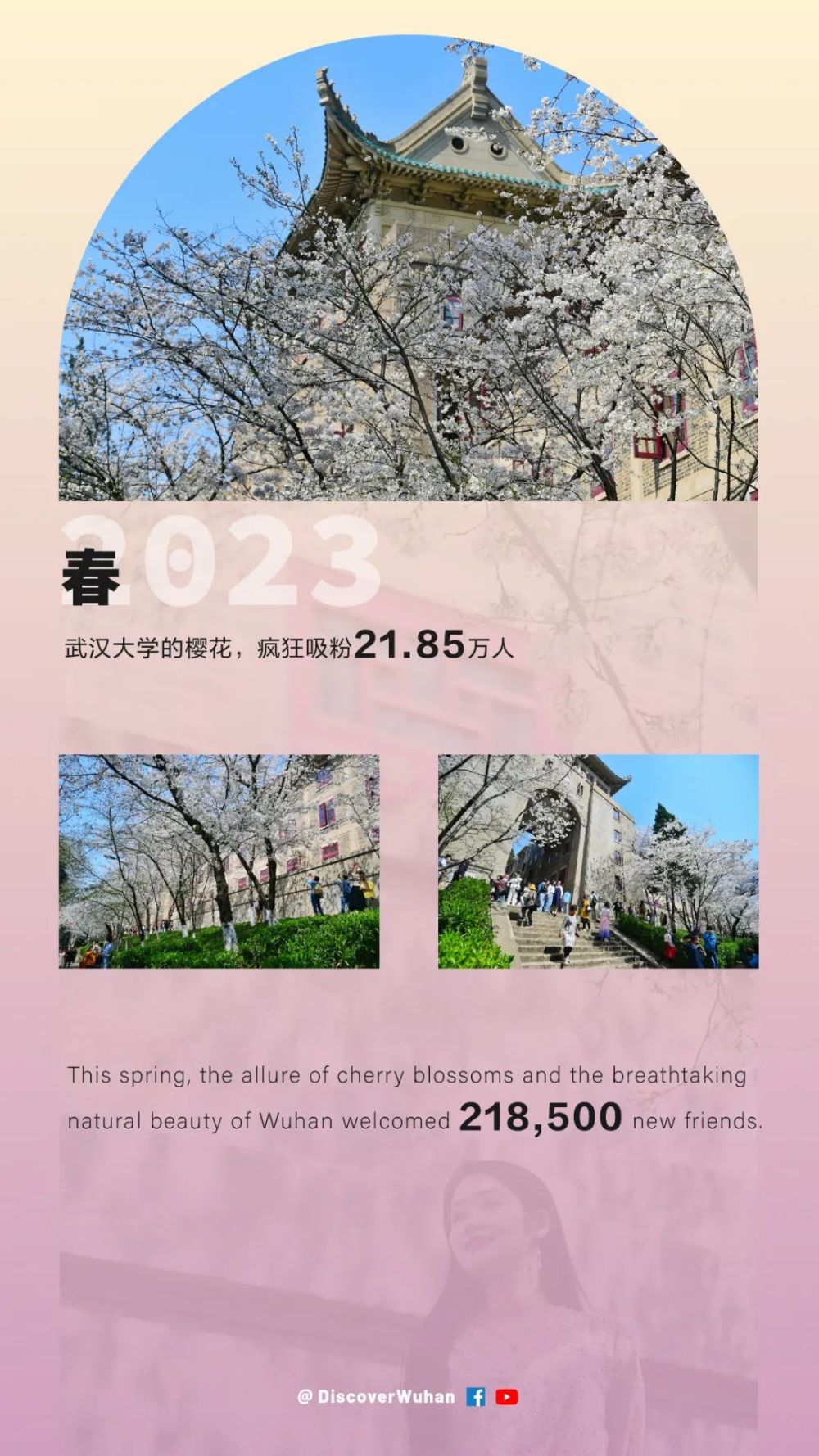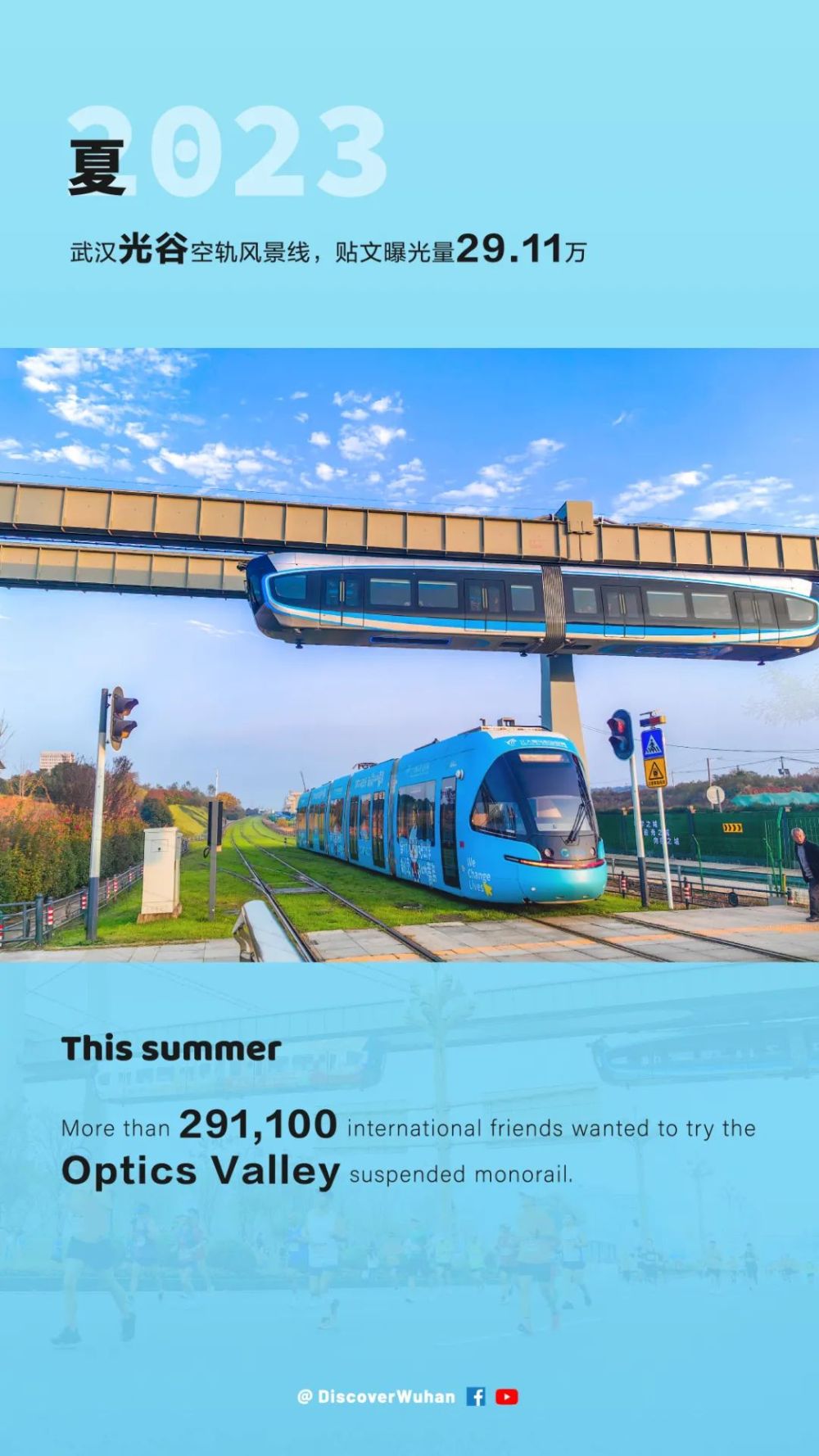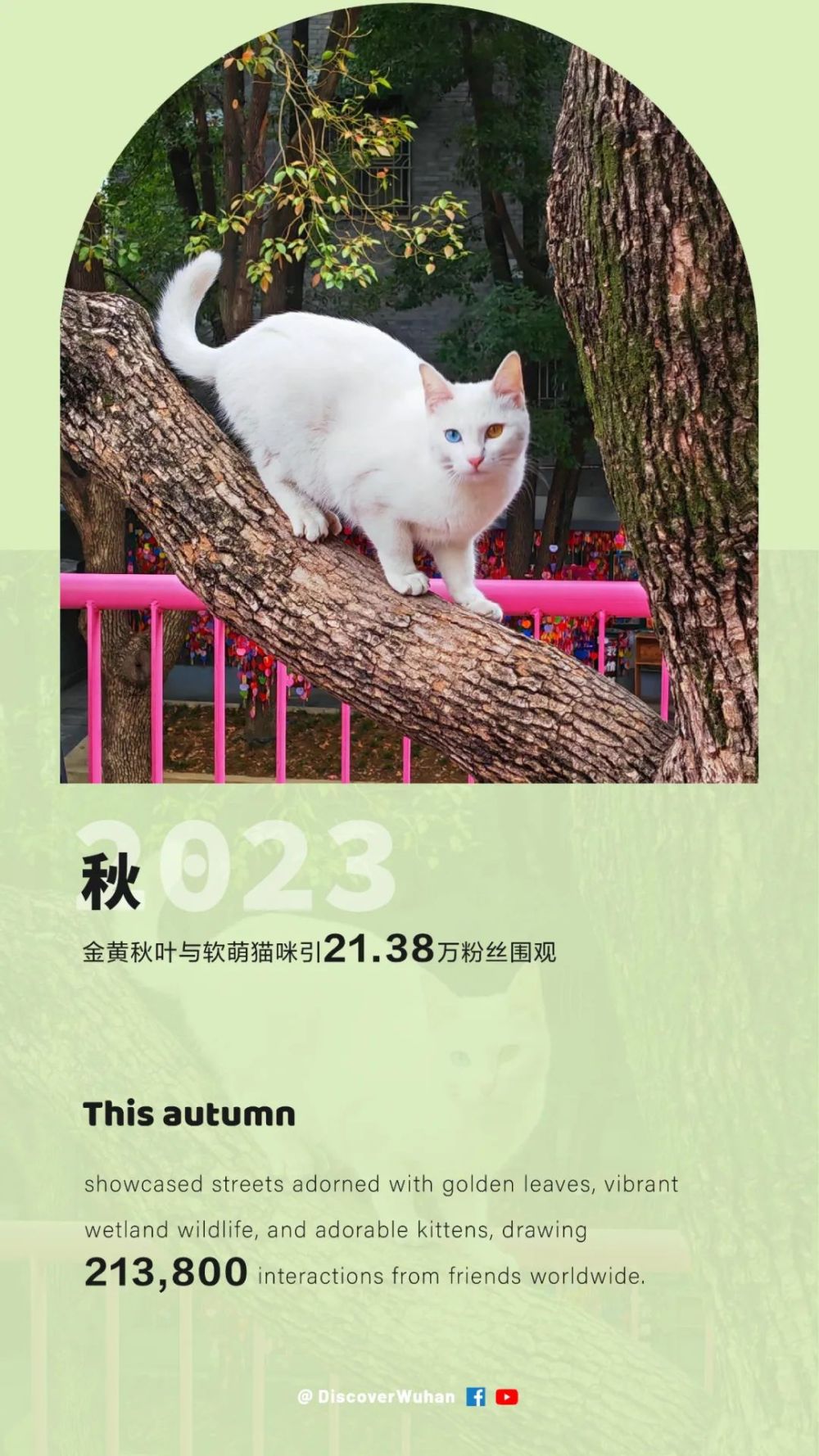 在这365天的一轮春夏秋冬里——武汉大学的樱花已经成为春天来汉必打卡景点;光谷空轨开通,不仅在盛夏迅速成为本地热门,还成功撩拨到粉丝的心弦;秋季,毛绒绒的猫咪最惹海外网友喜爱;冬天天气虽冷,但是在武汉能处处感受到这座城市的温暖。