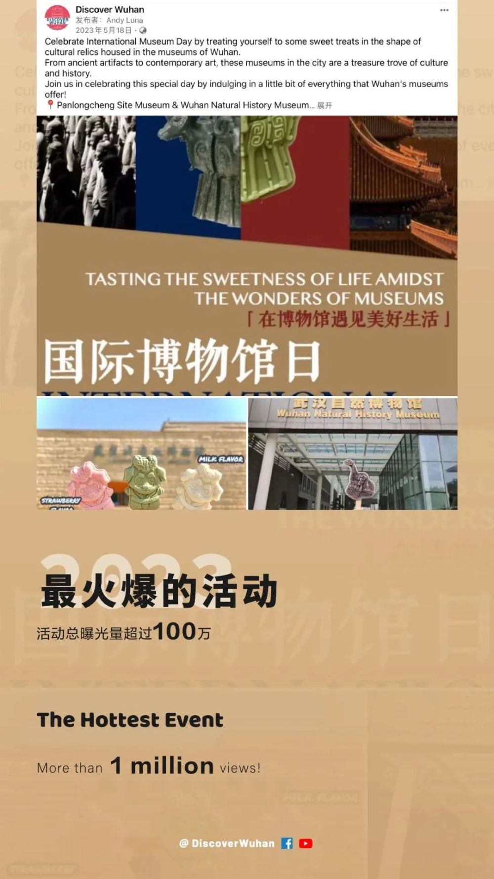 最火爆的活动省博5月18日,武汉、海口、鄂尔多斯等全国海外媒体账号线上联动,纷纷展示本地博物馆中的奇珍异宝与文化魅力。博物馆含量最高属武汉,省博魅力挡也挡不住,国际博物馆日活动在海外总曝光量超过100万,互动量超1.5万。