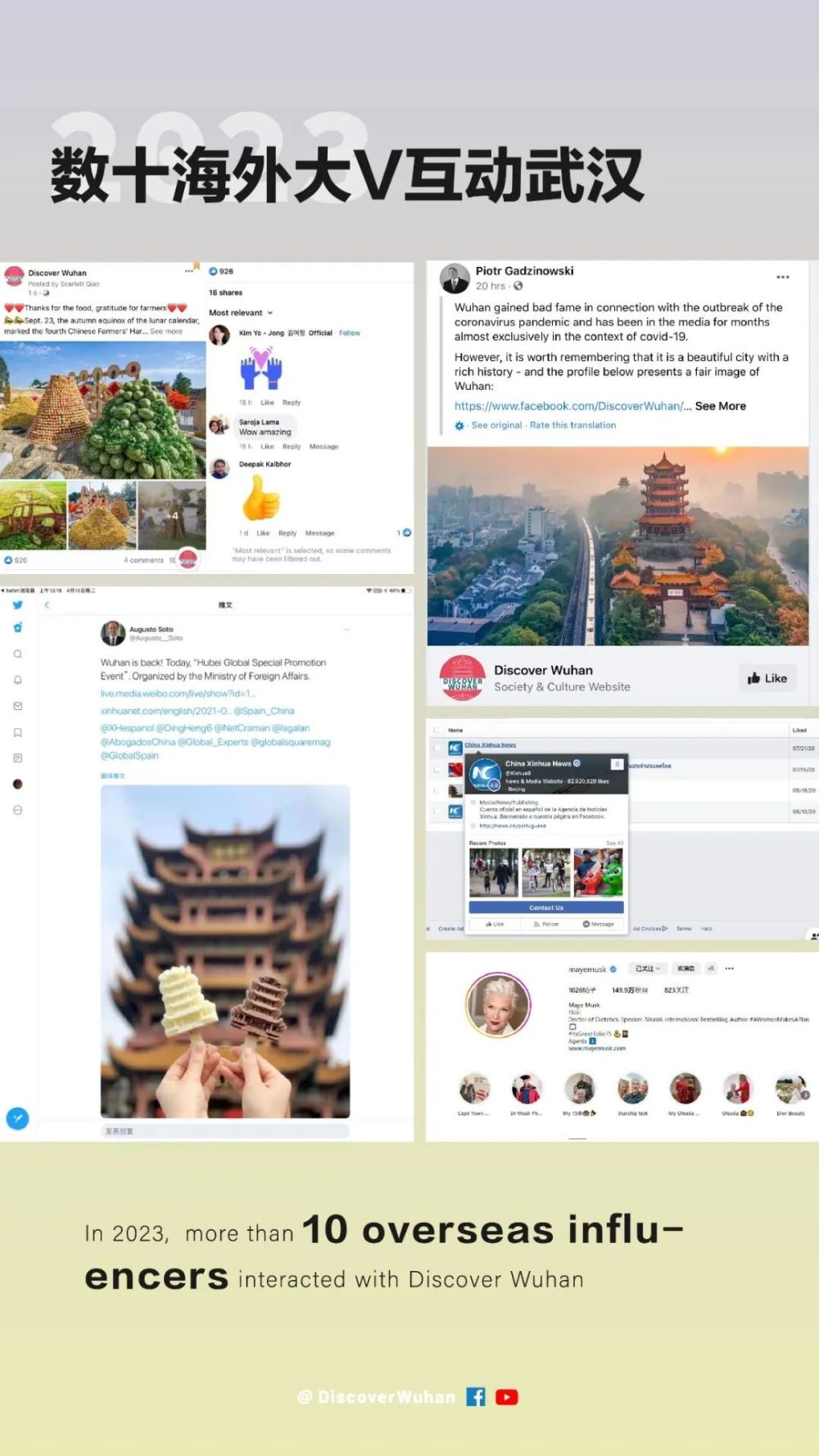 这份评选结果得到了国际大V的认可外交部部长助理华春莹、日本纪录片导演竹内亮、巴基斯坦《DiploMag》外交杂志资深专家比拉尔·萨博利、西班牙ESADE商学院著名教授苏傲古、波兰《论坛报》总编辑Piotr Gadzinowski、法国资深媒体人Mar SERRANO PAEZ等国际大V都在线上密切关注武汉;新华社2000万粉丝文旅大号发布铸铜贴文并与“发现武汉”账号互动;206万旅游博主账号Wanderlust with Sylvia发布武汉非遗油纸伞贴文;203万旅游博主账号New Marco Polo发布武汉解放公园郁金香贴文;马斯克母亲梅耶·马斯克点赞照片墙的武汉江汉关贴文……这365天里,武汉的国际朋友圈又扩大了!