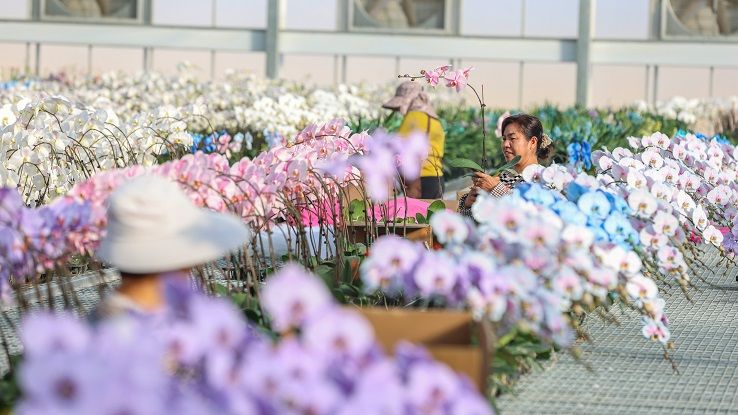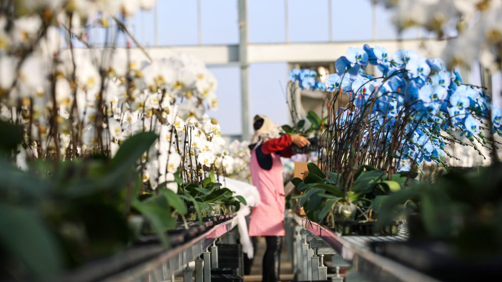 得益于产业园先进的设施设备,花卉种植不再受季节和气候影响。蝴蝶兰基地种植的蝴蝶兰、红掌和杂属兰,实现全年种植,周年化生产。近期,蝴蝶兰每株批发价为15元至30元,红掌每株批发价为20元到25元,价格均小幅上涨。