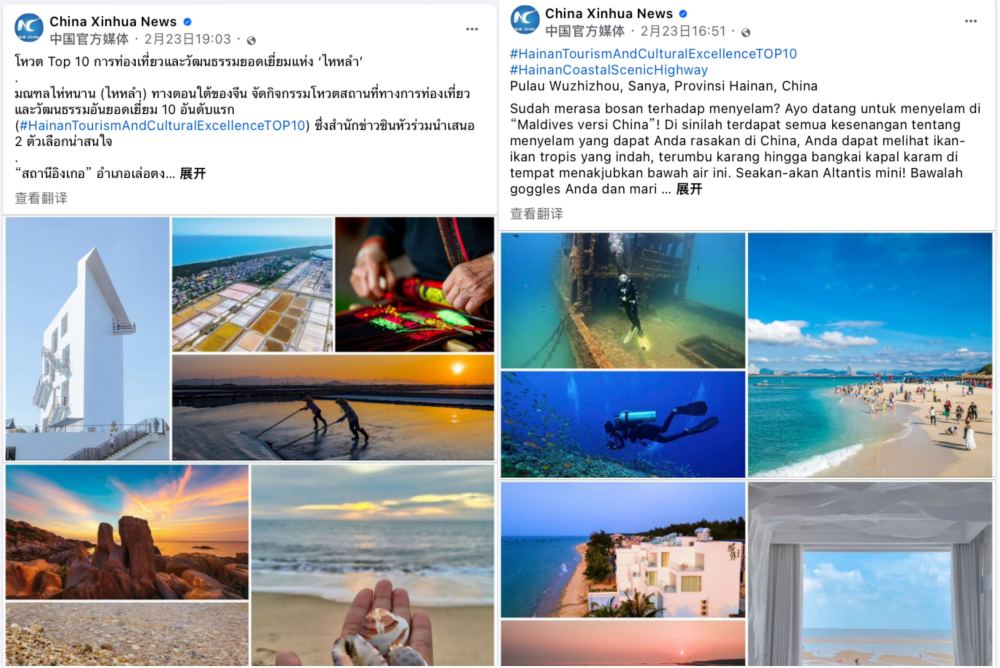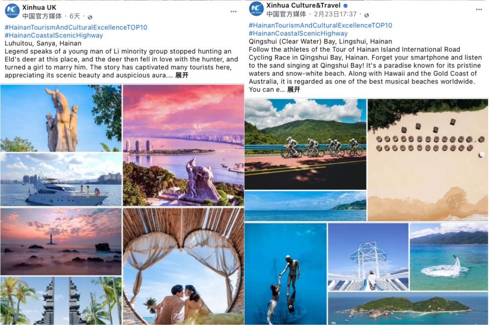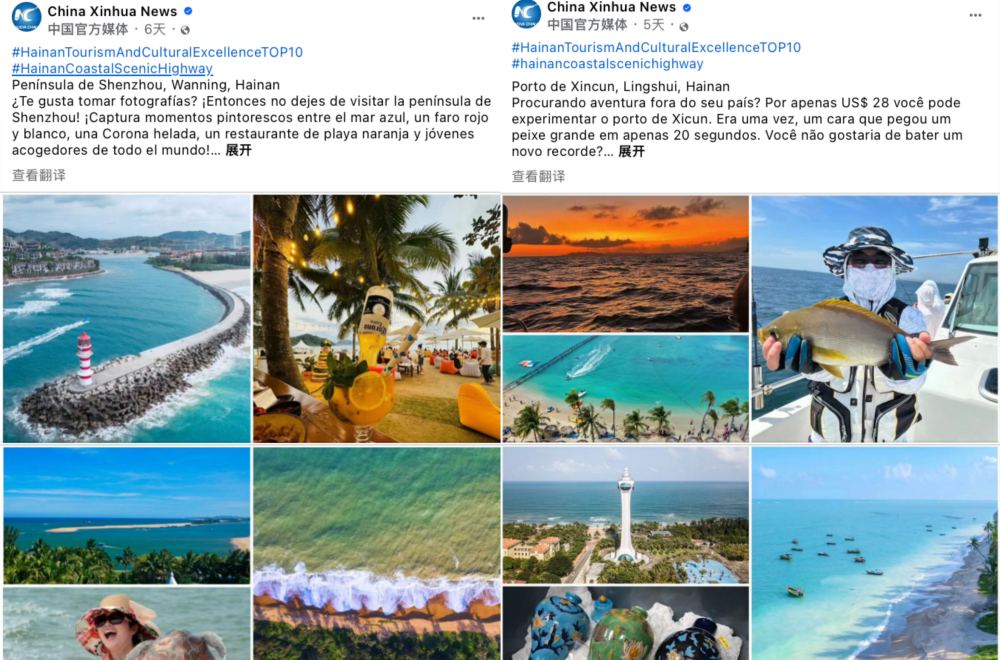 ↑新华社海外社交媒体“China Xinhua News”主账号、西班牙语、葡萄牙语、印尼语、泰语账号,“Xinhua Culture&Travel”文旅账号,“Show Me China”网红账号以及“Xinhua UK”英国账号,以5种语言发布海南旅文精品top10评选活动第一批推文。