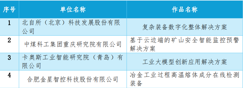 其中,来自北自所(北京)科技发展股份有限公司的“复杂装备数字化整体解决方案”、中煤科工集团重庆研究院有限公司的“基于云边端的矿山安全智能监控预警解决方案”、卡奥斯工业智能研究院(青岛)有限公司的“工业大模型创新应用解决方案”、合肥金星智控科技股份有限公司的“冶金工业过程高温熔体成分在线检测装备”分别荣获各赛道一等奖。