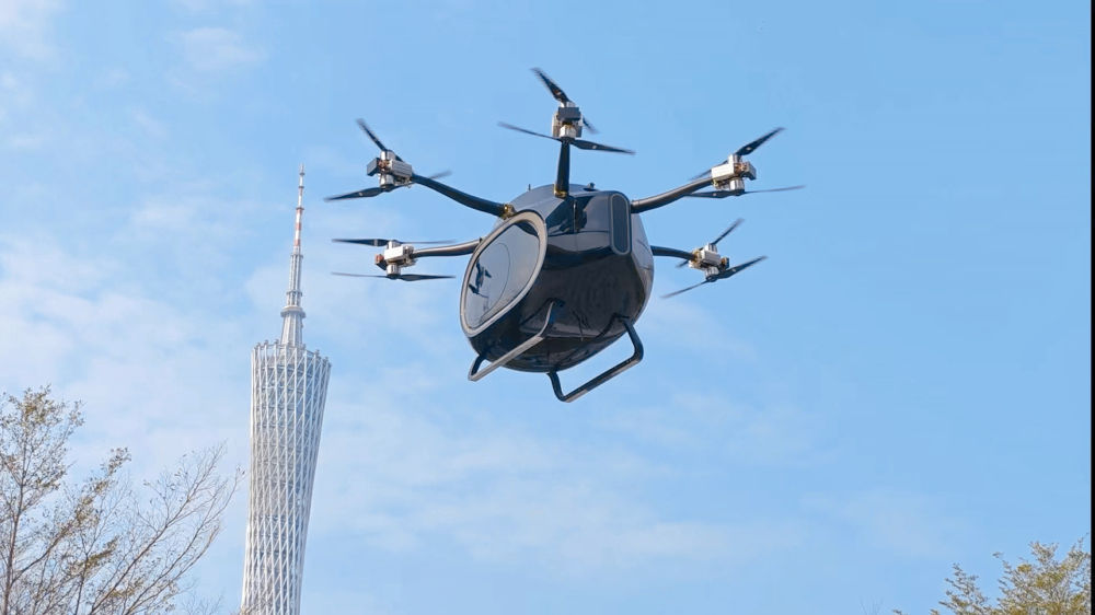 广汽飞行汽车GOVE在广州CBD上空进行飞行展示。(广汽集团供图)