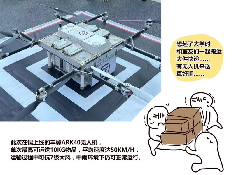 无人机设备正加速融入无锡生活的方方面面,目前7条无人机低空配送航线获批,其中,由顺丰旗下丰翼科技与江南大学的合作航线备受瞩目,江南大学也成为全国首个“无人配送”示范高校。通过在江南大学摸底,无锡市交通运输局低空经济发展处副处长蔡羽介绍,该校快递业务旺盛,在确保安全、控制噪音的前提下,满足Z世代“懒得取快递”的代步需求,为校园带来“低空+”消费新体验。