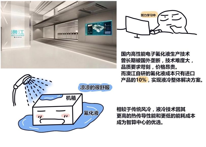 记者马上联想到此行关注的硬核冷却产品——电子氟化液。成立于2020年的澳江(无锡)网络能源有限公司,其自研的浸没式液冷技术可使整体能耗降低30%到50%,噪音也会降低20分贝到35分贝。今年年初,中国电信无锡分公司机房尝试液冷散热方式,其5G基站能耗相比传统散热方式降低近30%,助力碳达峰、碳中和。