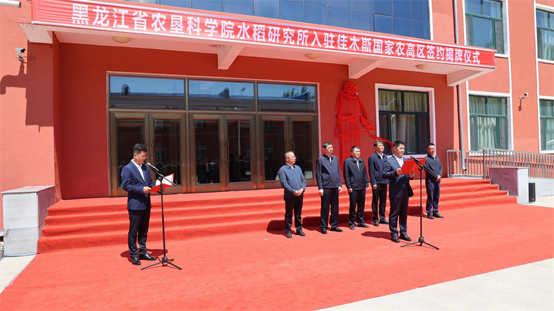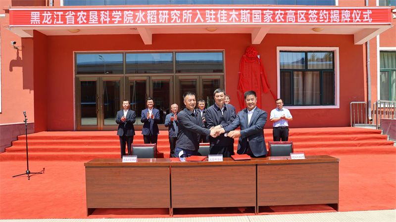 新华社客户端哈尔滨6月27日电 6月26日,黑龙江省农垦科学院水稻研究所入驻佳木斯国家农业高新技术产业示范区签约揭牌仪式在北大荒集团建三江分公司举行。北大荒农垦集团党委委员、副总经理姜庆海,佳木斯市副市长、佳木斯国家农高区党工委书记王继武共同为农垦科学院水稻所入驻佳木斯农高区揭牌。