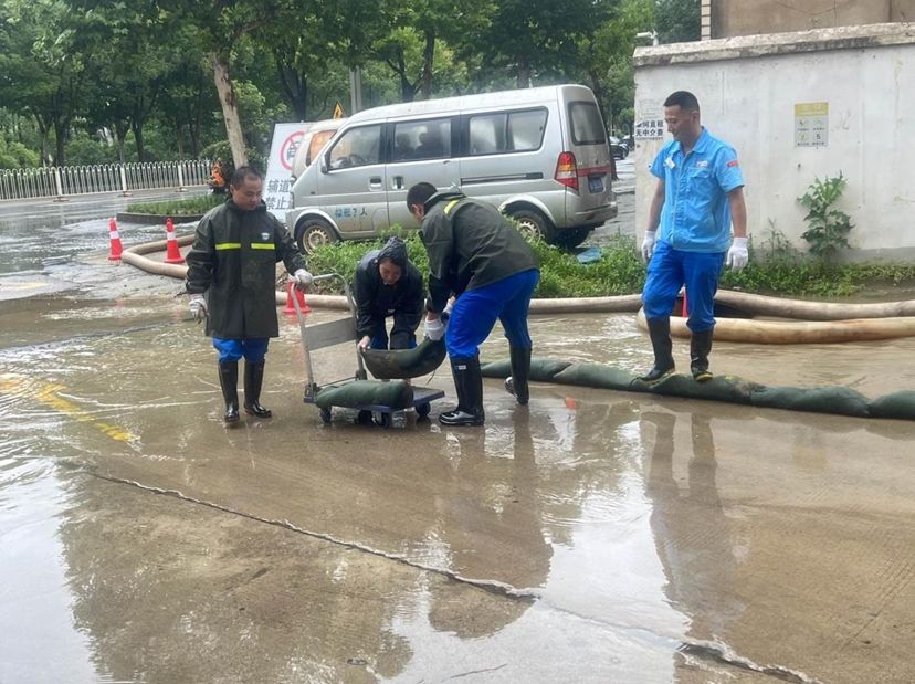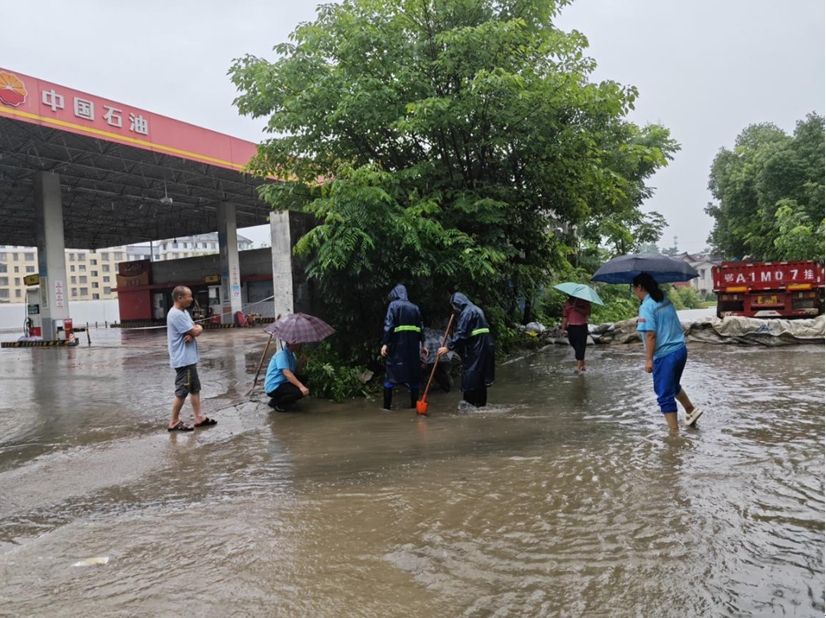 上午10时许,武汉朱家河加油站现场积水升高,机关人员、汉口片区防汛小分队迅速到达现场,打开市政排水管网盖板,组织使用排水泵抽排积水,筑起沙袋墙。