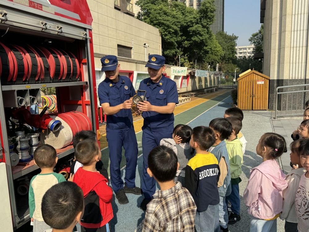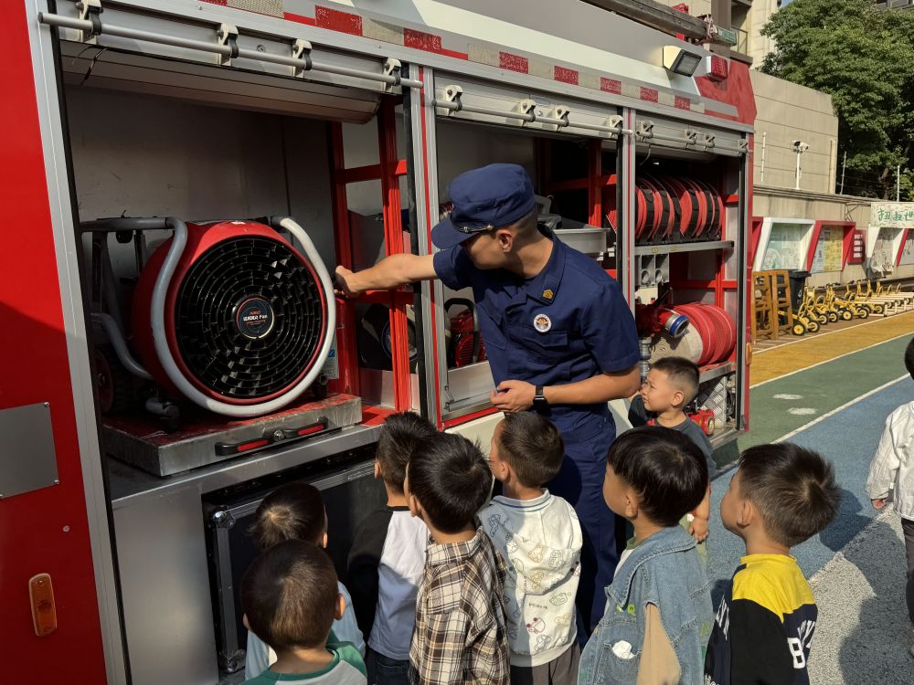 江汉区消防救援大队的消防员现场展示消防车、消防器材,详细讲解消防安全常识。并组织师生“零距离”体验消防护具,耐心指导师生如何在紧急情况下做好个人防护。