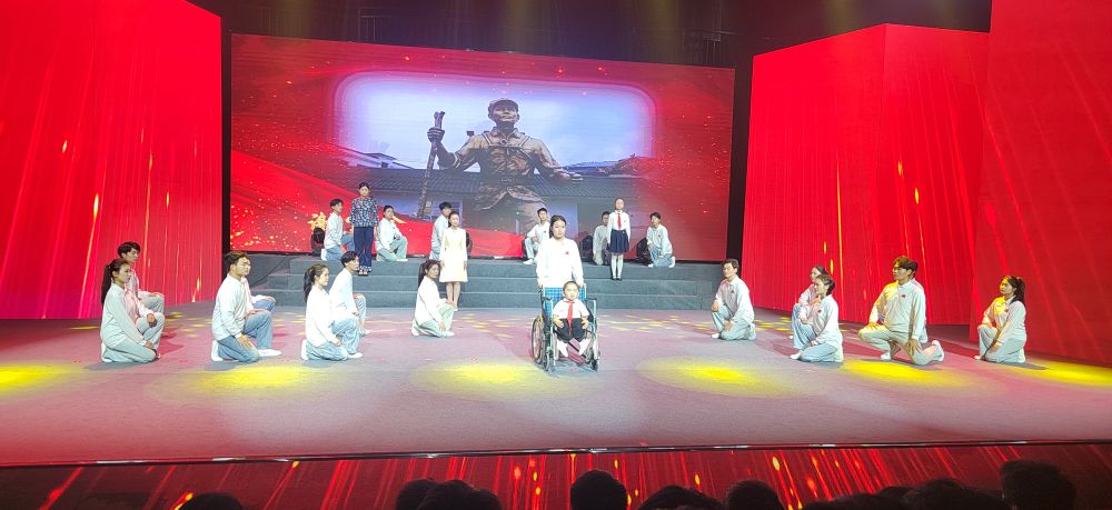 11月23日晚,赣州市获得全省中小学生“红色故事我来讲”活动一等奖的选手何炜京(中)在萍乡进行展演。
