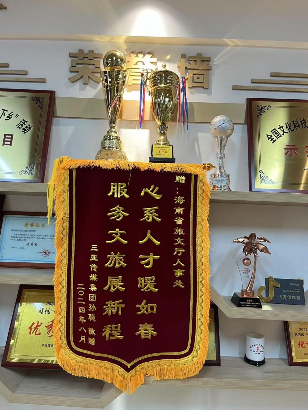 ↑三亚传媒影视集团广播部副总监孙聪向省旅文厅人事处送来的锦旗。