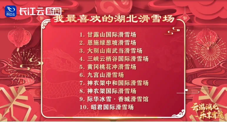 2025“云游湖北 乐享宵遥”长江云新闻蛇年元宵特别直播节目公布了“我最喜欢的湖北滑雪场”选票结果。经社会各界网络投票,甘露山国际滑雪场(武汉城建热雪奇迹)以超12万票获评“我最喜欢的湖北滑雪场”第一名。