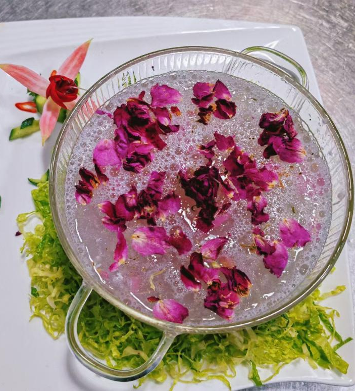 学习食用花卉烹饪技艺超30年的孙丽波,正带领团队积极申报非遗项目,以期进一步传承与发展“百花宴”,同时她们引入液氮真空锁鲜等技术,有效延长花卉食材的保鲜期,以满足游客对鲜花供应的需求。