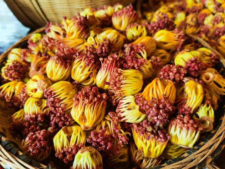 在麒麟区,可食用的鲜花种类繁多,芭蕉花、核桃花、棠梨花、石榴花……鲜花的配菜也十分考究,通常使用当地特色蔬菜、调料等进行搭配,让菜肴味道更加丰富和独特。餐馆内,一朵朵鲜花经过浸泡、搓洗、焯水等工序,褪去了原有的苦涩,再配上腌制的腊肉,让油脂进一步中和鲜花的微苦,而鲜花的清香则化解腊肉的油腻,二者相得益彰,让食客品尝花卉菜肴的独特风味。