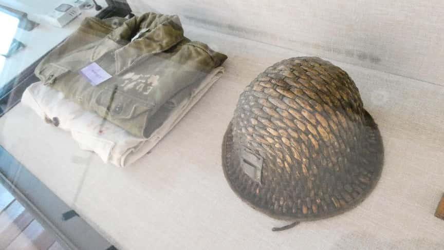 ↑穆棱煤矿矿工早期使用过的工服和安全帽。