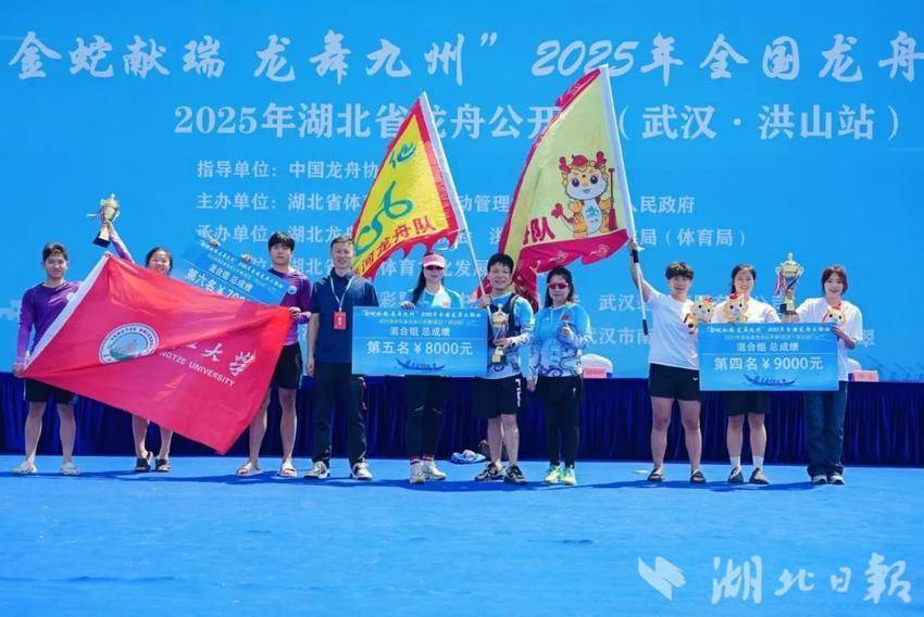 经过层层选拔与科学集训的湖北省男子龙舟队成为全场焦点,他们最终获得200米、500米直道双冠及总成绩第一,江汉大学、湖北商贸学院分列总成绩二、三名。混合组较量中,武汉体育学院、武汉车谷、随州水上运动协会龙舟队跻身前三。身披吉祥物主题战袍的“洪小龙”龙舟队奋勇争先,最终斩获混合组第四名。赛后教练表示:“‘洪小龙’不仅是队魂,更承载着洪山人敢拼敢闯的精神!”
